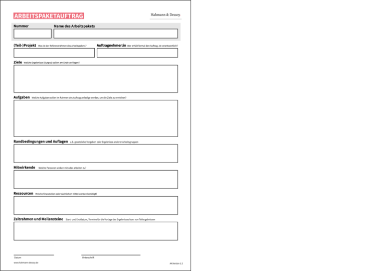 Die Arbeit in Projekten wird erleichtert, wenn die Projektaufgaben in Arbeitspakete zerlegt werden, die überschaubar und gut zu handhaben sind. Die Karte unterstützt bei der Planung und Konkretisierung von Arbeitspaketen und der Formulierung des zugehörigen Auftrags.